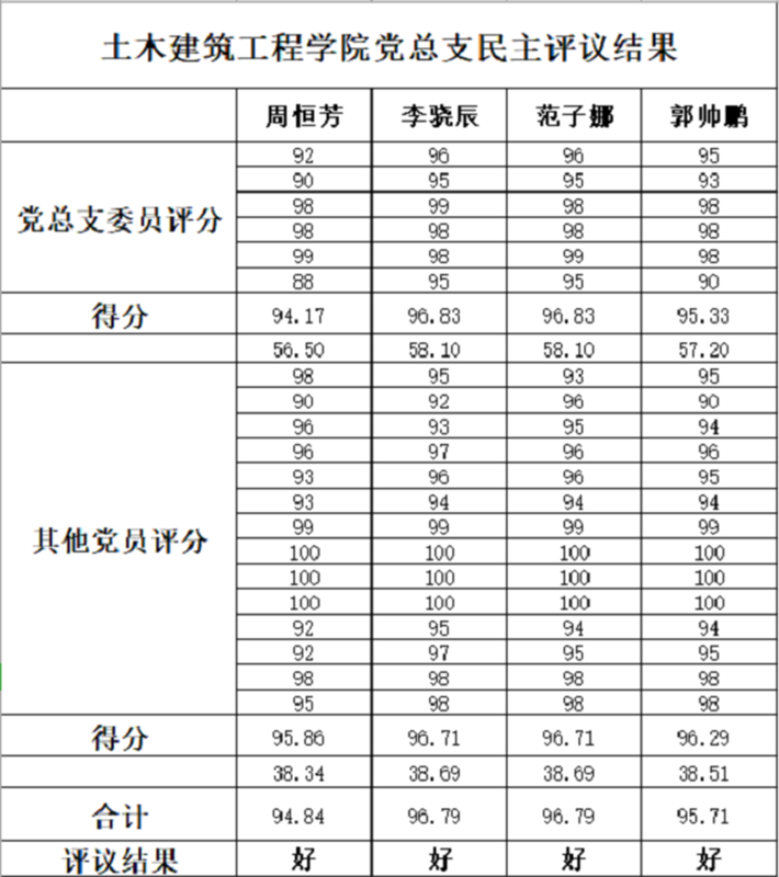 各基层党支部书记述职完毕后,王志勇同志对各基层党支部书记的党建工作实绩给与了充分肯定,自学院党总支成立至今,各基层党支部书记为推动基层党建工作的规范化建设做出了大量工作,表现出了较强的责任意识与担当精神,同时也指出存在“执行制度规范不严、学生党员教育不畅、基层研究党建不多”等问题。最后,由参会人员根据述职情况及平时了解对各基层党支部书记进行测评打分,按照好、较好、一般、较差4个档次进行评价,并汇总公示。