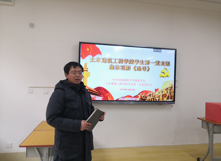 为更好弘扬红色文化、传承红色基因,按照省委“不忘初心、牢记使命”主题教育工作安排部署。土木建筑工程学院学生第一党支部于2019年12月16日在日省楼开展“红色观影”活动。本次活动由土木建筑工程学院各党支部书记主持,参与人员为土木建筑工程学院学生各党支部全体党员。