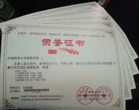 河南师范大学新联学院土木建筑工程学院的2014级土木工程专业(本科)学生李华杰、黄凯,2016级土木工程专业(本科)学生杜金雨、马国林、王子露等五名同学组成的“Civil Engineering”团队,在指导老师王卫玲、杨嫚嫚、甘孟冬及关洪亮的精心指导下,刻苦学习与训练,顺利通过了前期的网络晋级赛。5月20至21日,在王震、杨嫚嫚老师的带领下,“Civil Engineering”团队赴杭州参加了本次决赛。在全国决赛中,“Civil Engineering”团队面对知名高校和富有比赛经验的团队,充满自信,通过拼搏获得了“全能二等奖”、《工程管理专项》专项奖二等奖、《绿色建筑分析专项》专项奖二等奖、《工程设计专项》专项奖三等奖、《工程造价专项》专项奖三等奖等五个奖项。