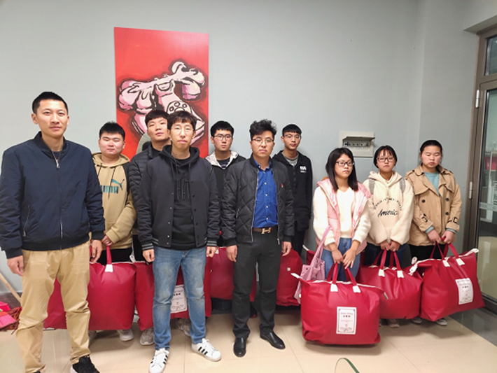首先, 王志勇向在场同学介绍了国家补助政策和学校资助体系,希望同学们在接受补助的同时感受到社会对他们的关爱。然后辅导员赵益用他自己的求学经历来勉励大家,希望同学们能够坚强地面对生活中遇到的挫折和挑战,并希望同学们树立自己的大学目标,做好大学四年的学习计划,不忘初心,砥砺前行。仪式最后,由三位老师为受助学生亲自发放冬季补助物资。