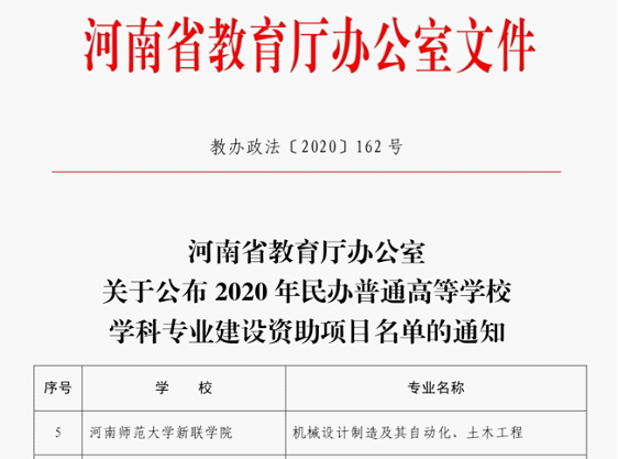 近日,河南省教育厅发布了《河南省教育厅办公室关于公布2020年民办普通高等学校学科专业建设资助项目名单的通知》(教办政法〔2020〕162号),我院土木工程专业凭借突出的专业实力和专业特色被确定为河南省2020年民办普通高等学校学科专业建设资助项目。
