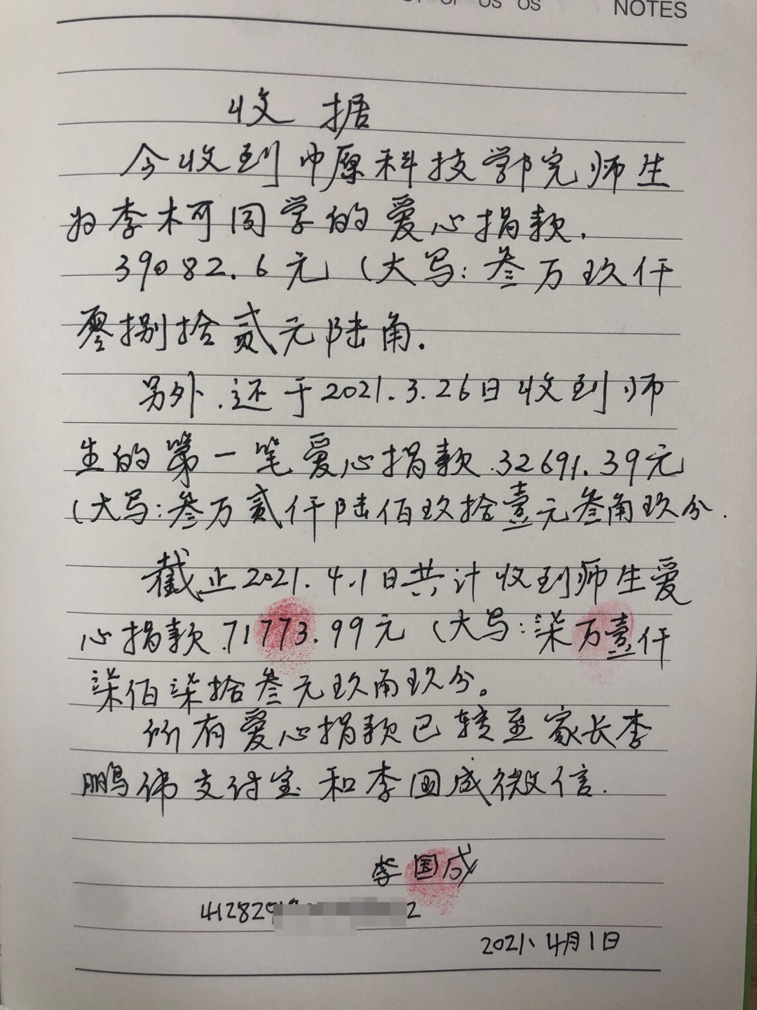 | 关于李柯同学的爱心捐款公示 | |||||