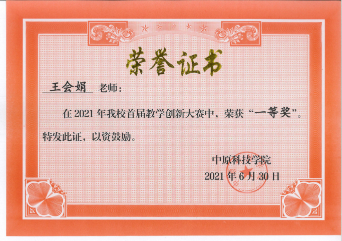 中原科技学院首届教学创新大赛一等奖(王会娟)、校级 |