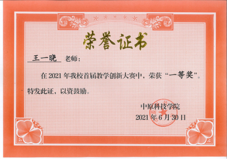 中原科技学院首届教学创新大赛一等奖(王一晓)、校级 |