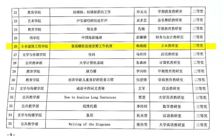 河南师范大学第三届微课大赛二等奖 《普通螺栓连接受剪工作机理》(杨嫚嫚)、校级 |