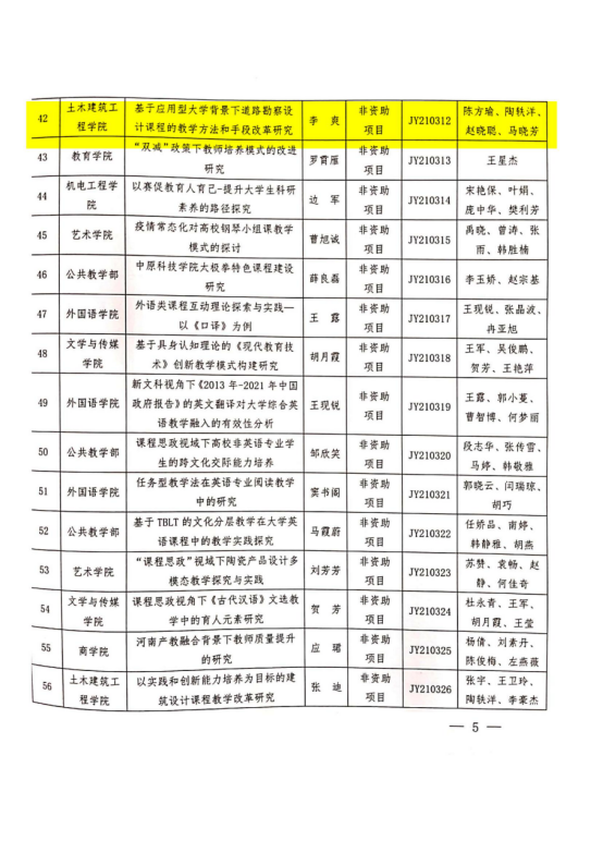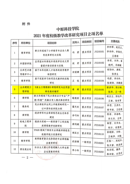 2021年校级教学改革研究项目,学院《《岩土工程勘察》课程研究与应用型特色教材编写》、 《基于应用型大学背景下道路勘察设计课程的教学方法和手段改革研究》2个项目立项