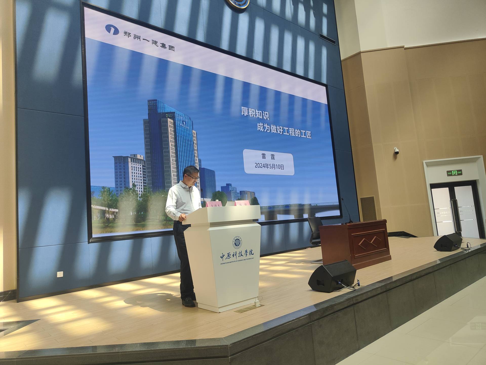 为增加2022级土木类本科学生对专业的了解,对专业分流清晰的定位,2024年5月10日,土建学院邀请郑州一建公司雷霆总工程师莅临我校做报告。雷霆先生为郑州一建集团有限公司总工程师,教授级高级工程师,全国建筑业优秀总工程师,全国工程建设质量管理先进工作者,全国创建鲁班奖工程先进个人,河南省学术技术带头人,河南省建筑业优秀总工程师、郑州大学创新实践基地硕士生导师,有着丰富的教学、建设实践和工程管理经验。