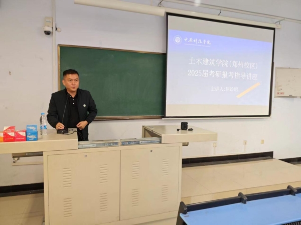 为提高我院考研率,帮助学生科学报考,土木建筑学院(郑州校区)于10月11日上午在日新楼508教室组织了一场考研报考宣讲,讲座由我院党总支副书记李鹏主持,河南城建学院屈讼昭教授主讲,2025届考研学生参加讲座。